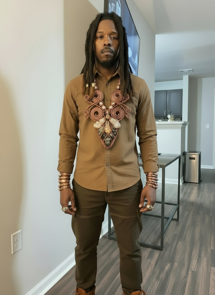 The Chunky Wire Wrapped Emperor Body Necklace for Men features powerful quartz and pyrite elements that enhance your energy and presence. Quartz amplifies clarity and focus, helping you stay centered and confident throughout your day. Pyrite adds a protective shield, guarding against negativity while boosting your ambition and drive. Together, these stones empower you to embody strength and resilience, making this necklace not just a bold accessory but a symbol of personal power and cosmic influence.
